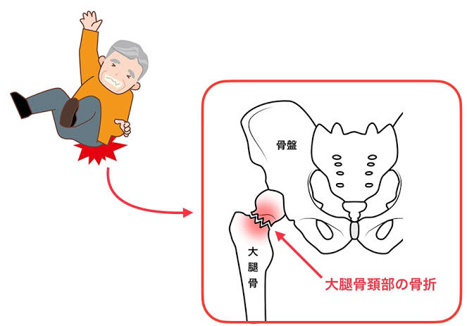 大腿骨としかニュースなどではあげられませんが高齢の場合ある程度折れるところに対して好発部位があります。それは大腿骨頸部骨折です。大腿骨頸部とは大腿骨の上部(骨盤にくっついている大体骨頭のすぐ下)を折ることが多いです